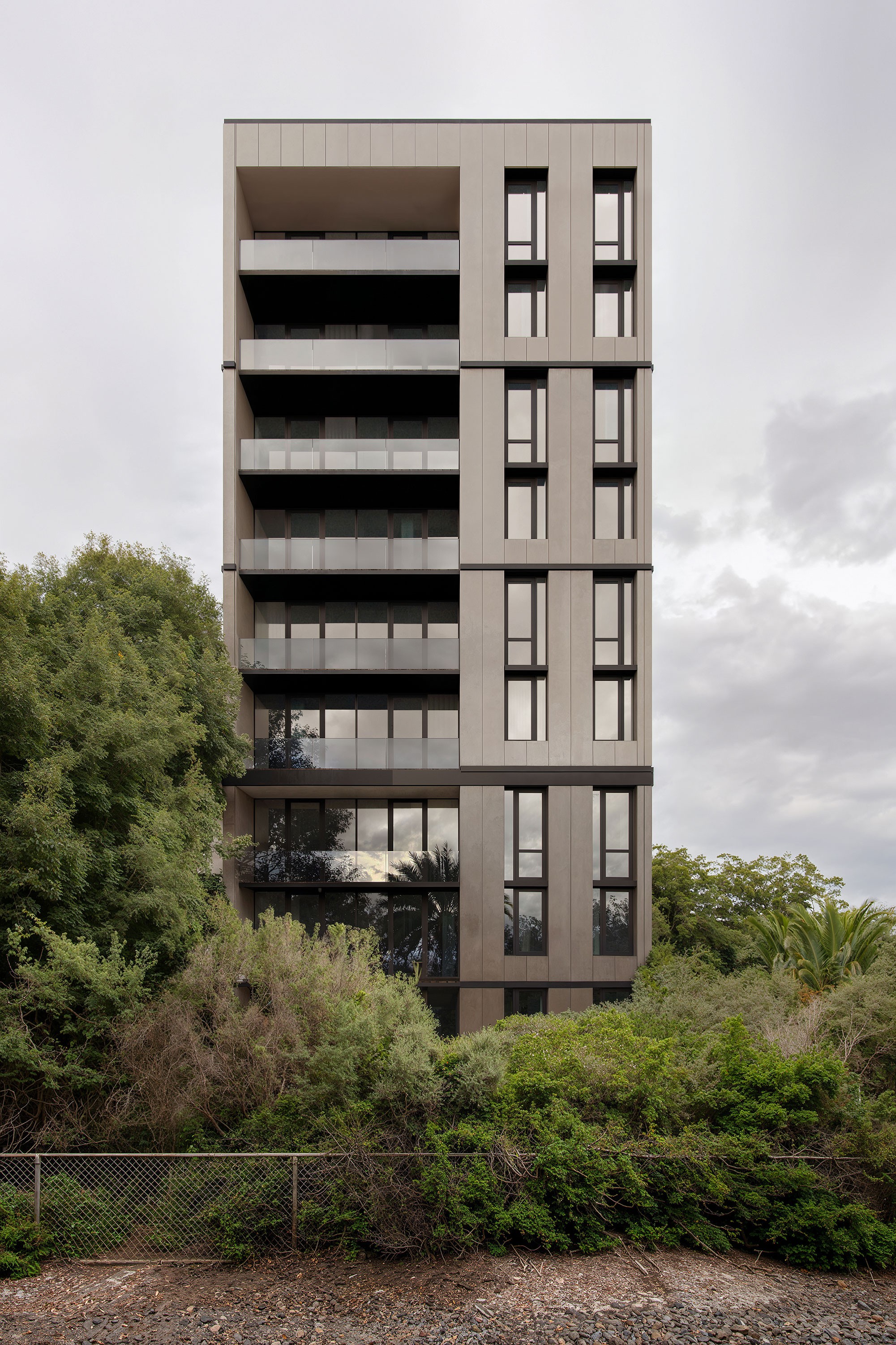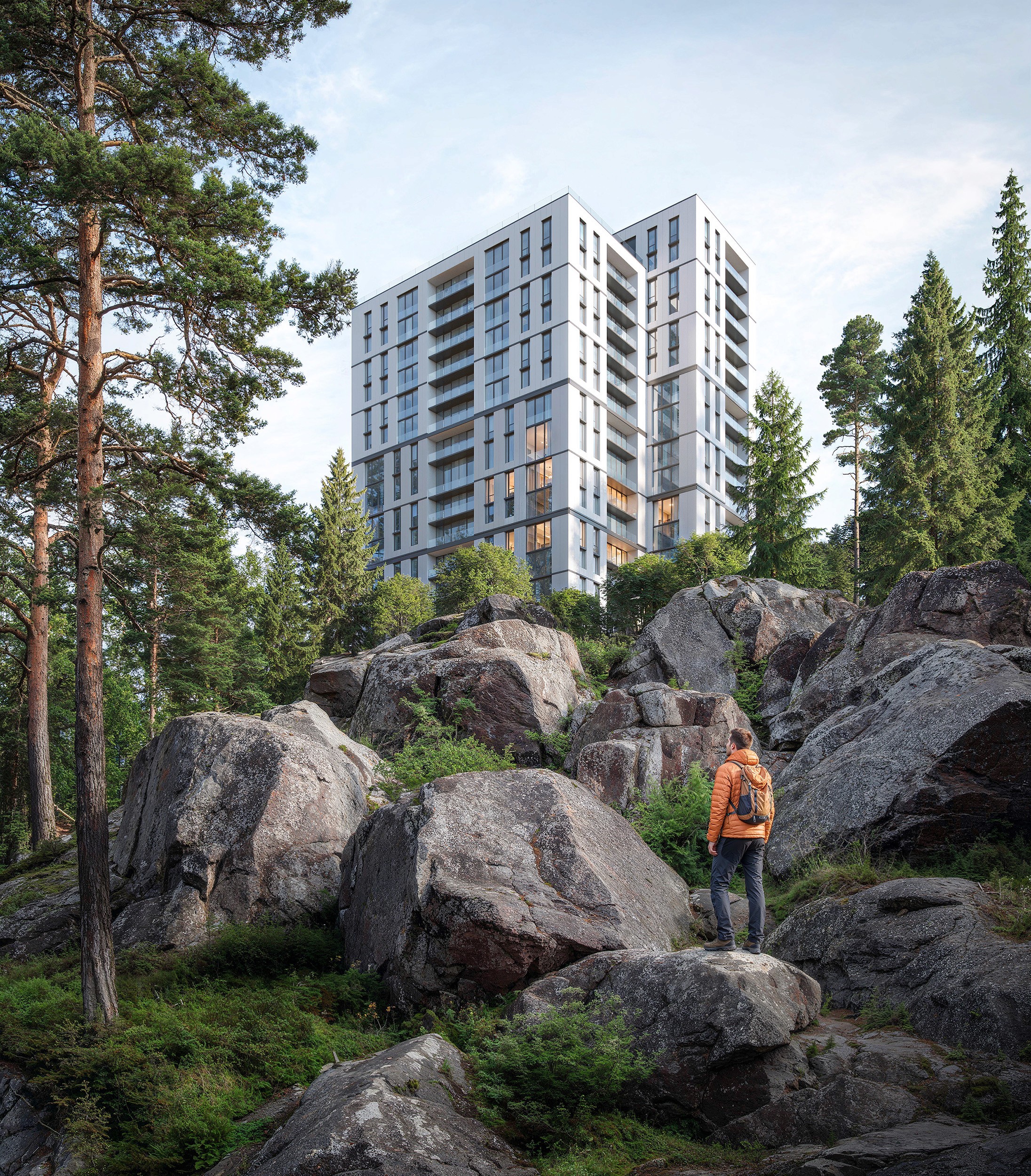 A residential tower rising from raw granite and pine forest.
