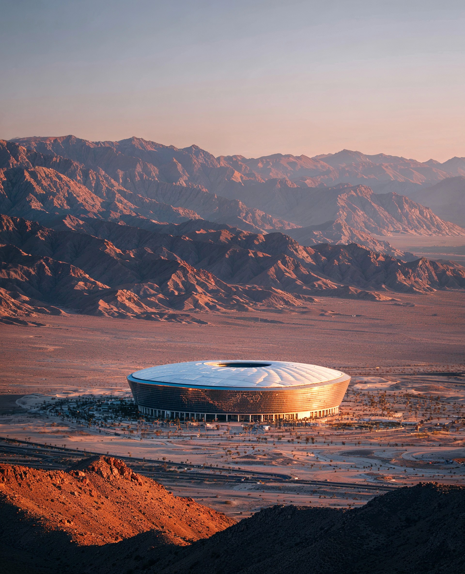 A large-scale arena set within the open desert landscape of Saudi Arabi