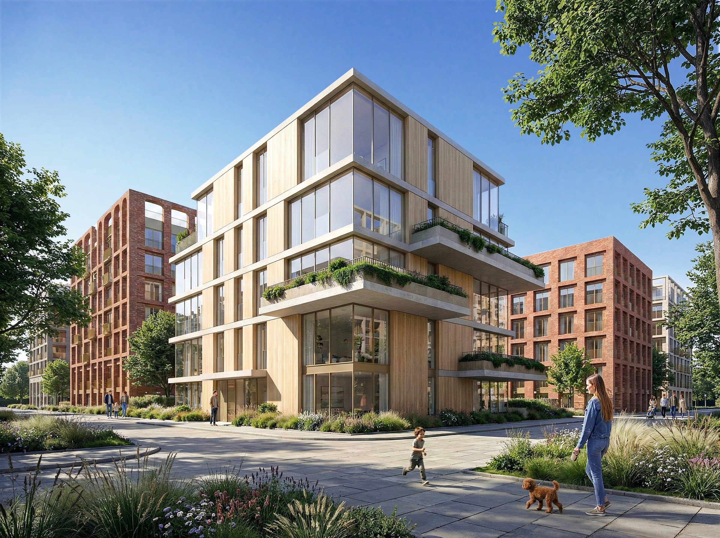 A mid-rise residential building defined by clear volumes, warm material contrast, and integrated greenery.