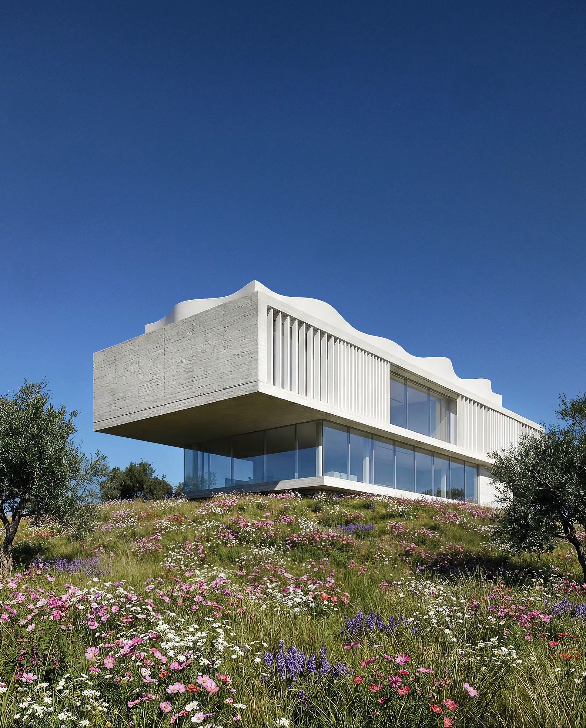 A restrained residential volume set into the hillside.